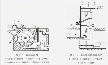 (2)轉動式篩網:轉動式篩網有水力旋轉篩網和轉筒篩兩種。水力旋轉網呈圓臺形,污水以一定的流速從小端進入,水的沖擊力 和重力作用使篩體旋轉,水流在從小端向大端的流動過程中得到過濾,雜質從大端落人渣槽。轉筒篩呈圓筒狀。