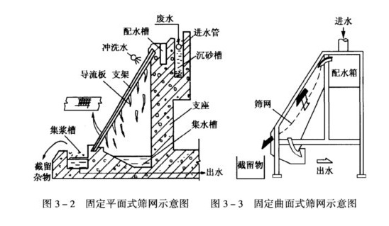 從結構上看,篩網是穿孔金屬板或金屬格網,要根據被去除漂浮物的性質和尺寸確定篩網孔眼的大小。根據其孔眼的大小,可分為粗濾機和微濾機;依照安裝形式的不同,篩網可分為固定式、轉動式和電動回轉式三種。 (1)固定式篩網:固定式篩網的型式為防堵楔形格網,大小為0.25~1.5mm,可以根據處理廢水的水質特點,在篩網的柵條上再覆以16~100目的不銹鋼絲網或尼龍網。常用固定式篩網根據構造形式分為固定平面式和固定曲面式,其示意圖分別見圖3—2和圖3—3。